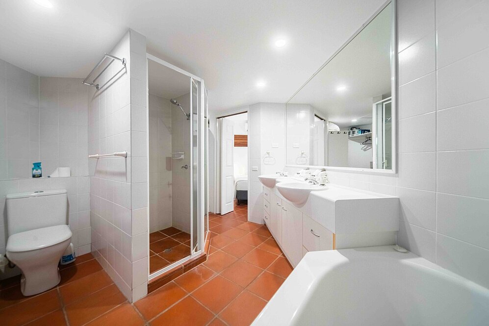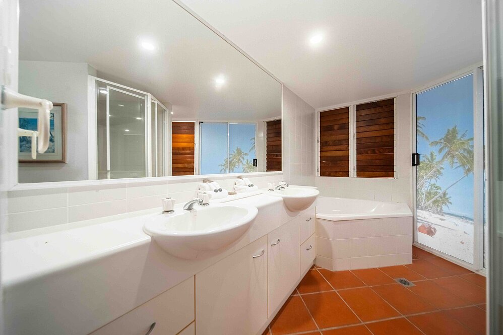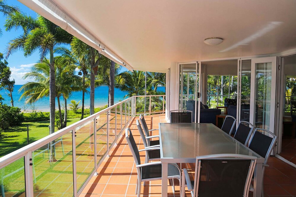 Beaches 6 offers three bedrooms which are air conditioned. All bedrooms in the apartment are fully air conditioned for your comfort year-round. The main bedroom with corner bath ensuite is on one end of this lengthy apartment. The open plan kitchen, living and dining open up through bi-folds to the front wrap around verandah and to the large rear verandah which is perfect for those sunny afternoon refreshers. Although the living space is not air conditioned, the wide bi-fold doors allow a beautiful sea breeze to flow naturally throughout the area. At the opposite end of the apartment are another two...