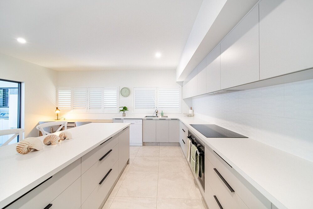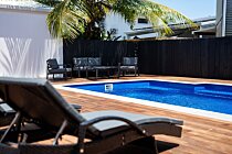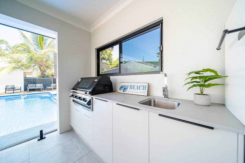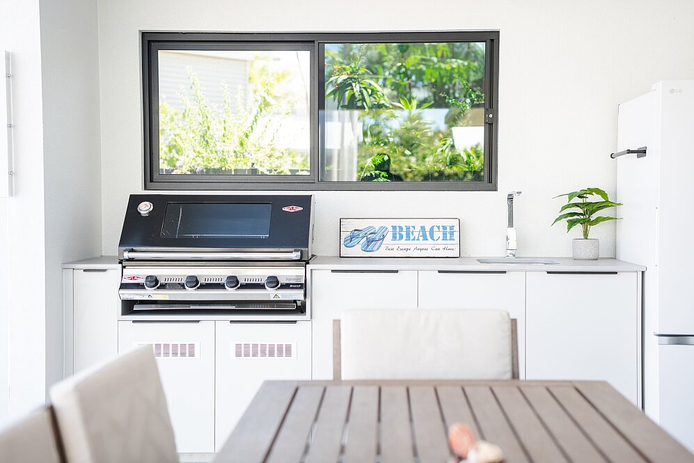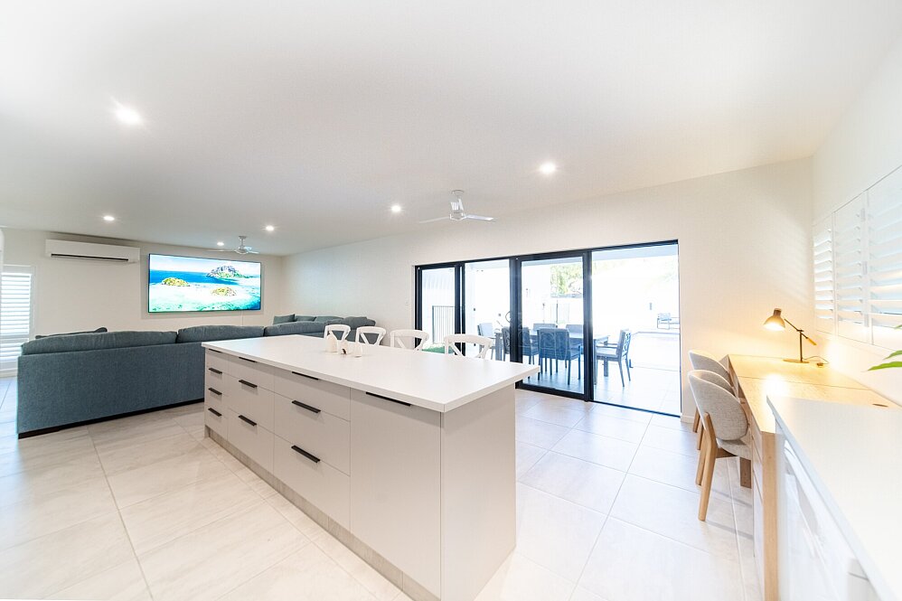 The expansive, fully equipped kitchen is perfect for entertaining a crowd, offering plenty of space for shared cooking, casual grazing, and preparing meals for the whole group. Whether you're hosting a long family lunch or whipping up a quick breakfast before a morning walk to the beach, the layout makes dining and gathering easy. The light-filled living and dining areas open onto a private deck overlooking the pool, creating an inviting setting for sunset drinks, BBQ nights, and alfresco meals with loved ones.